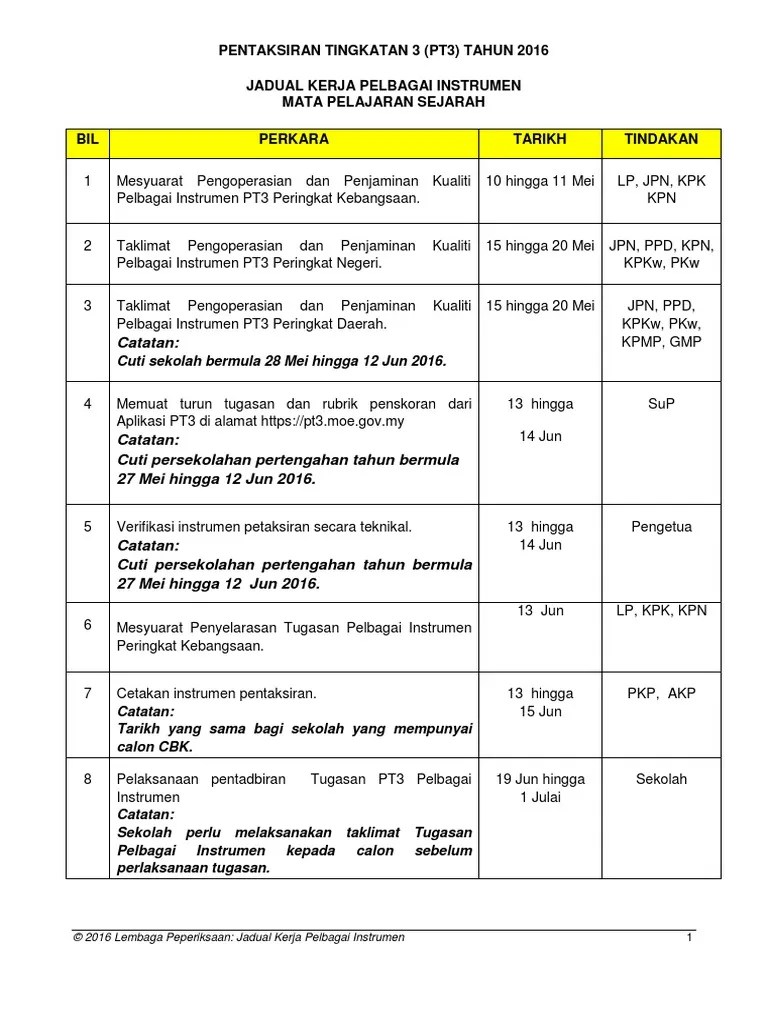 Pelajar Tingkatan 3 perlu menyiapkan Kerja Kursus yang merupakan jenis pentaksiran Pelbagai Instrumen yang terdapat dalam peperiksaan PT3. Panduan Tugasan Kerja Kursus Sejarah Tingkatan 3. Panduan Kerja Projek RBT Reka Bentuk dan Teknologi Tingkatan 3.