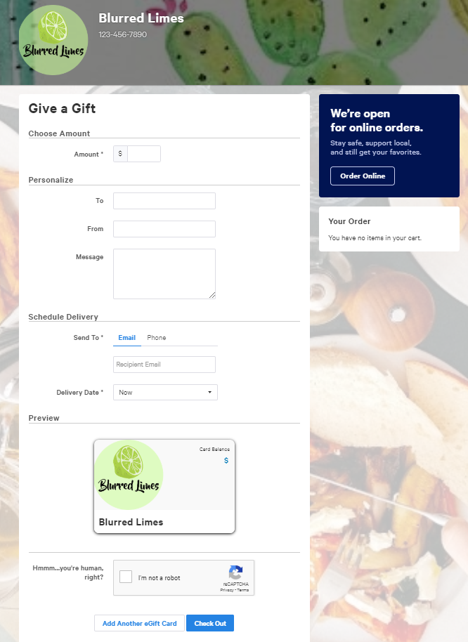 You have no items in your cart. Add Another eGift Card.